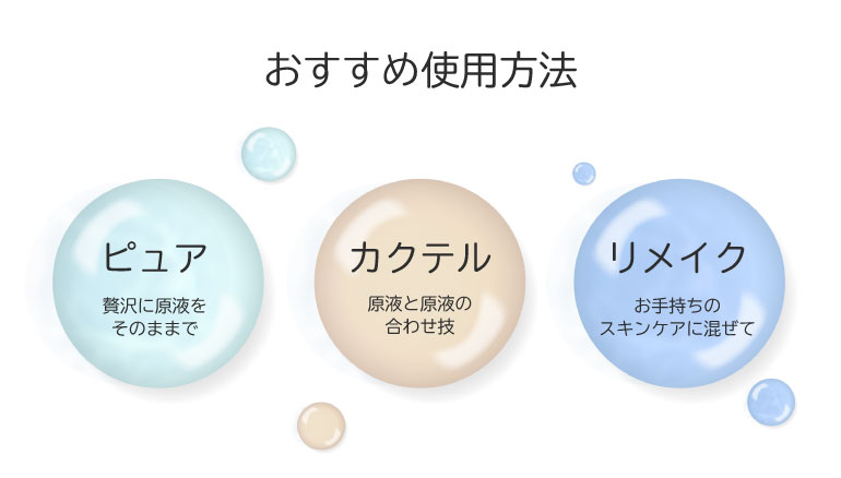 ●カクテル・リメイクでご使用いただく場合は、お肌につける直前にビンから出し、手の上でよく混ぜてからご使用下さい 。濃厚ですので、ボトルの中で混ぜると変質する恐れがあります。