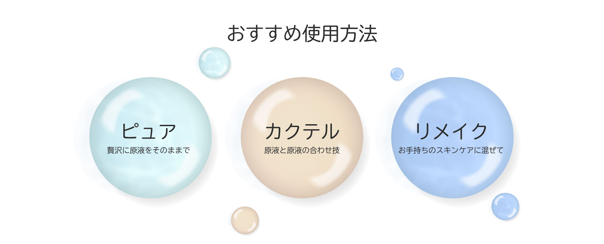 ●カクテル・リメイクでご使用いただく場合は、お肌につける直前にビンから出し、手の上でよく混ぜてからご使用下さい 。濃厚ですので、ボトルの中で混ぜると変質する恐れがあります。